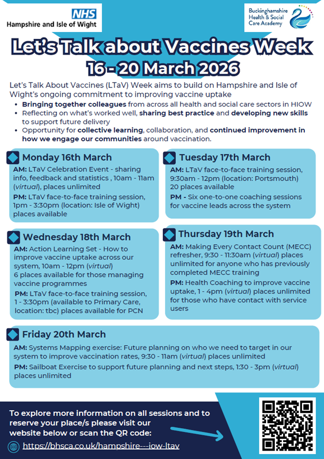 This week-long initiative is designed to strengthen collective efforts in improving vaccine uptake across our communities. Through a mix of virtual and face-to-face sessions, we’ll explore best practices, develop new skills, and foster collaboration across health and social care sectors.