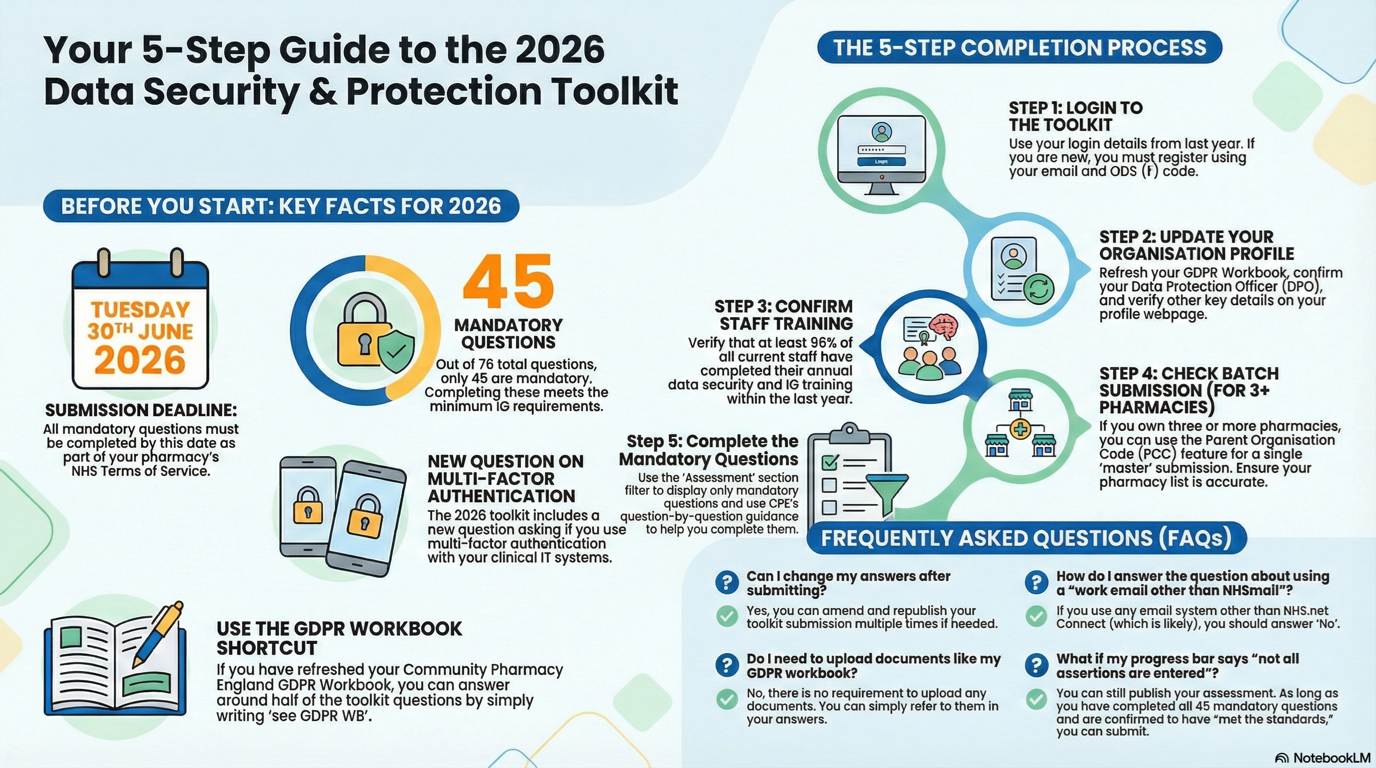 CPE will be holding a webinar on Wednesday, 11th February at 7.30pm to help Community Pharmacy owners to complete the Data Security and Protection Toolkit (DSPTK) for 2026.